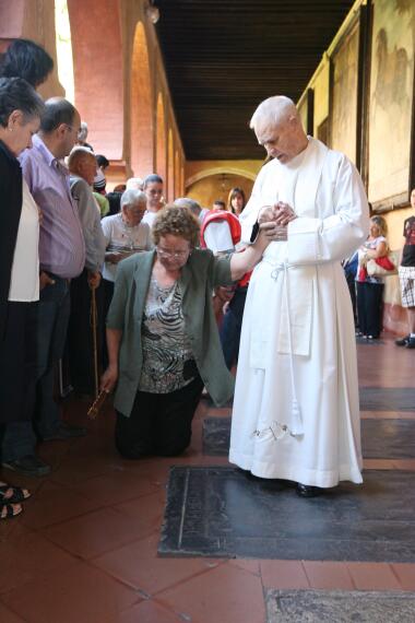 El día de Extremadura muchos peregrinos dan vueltas al claustro de rodillas